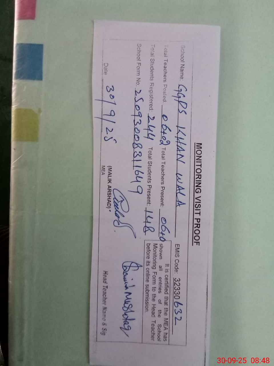 | Attendance Register | Head Teacher | MEA with School | Visit Proof |