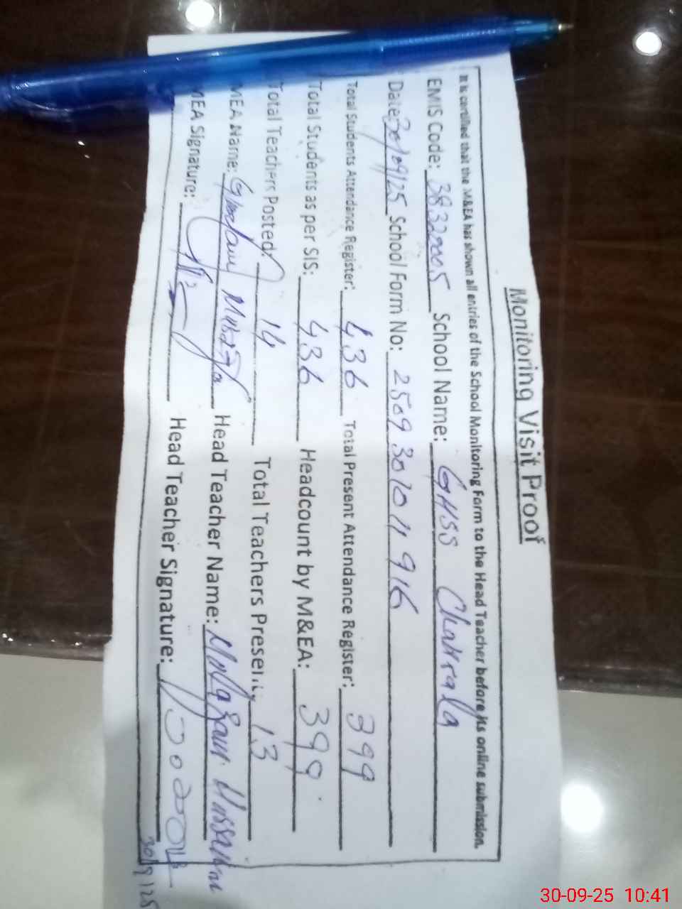 | Attendance Register | Head Teacher | MEA with School | Visit Proof |