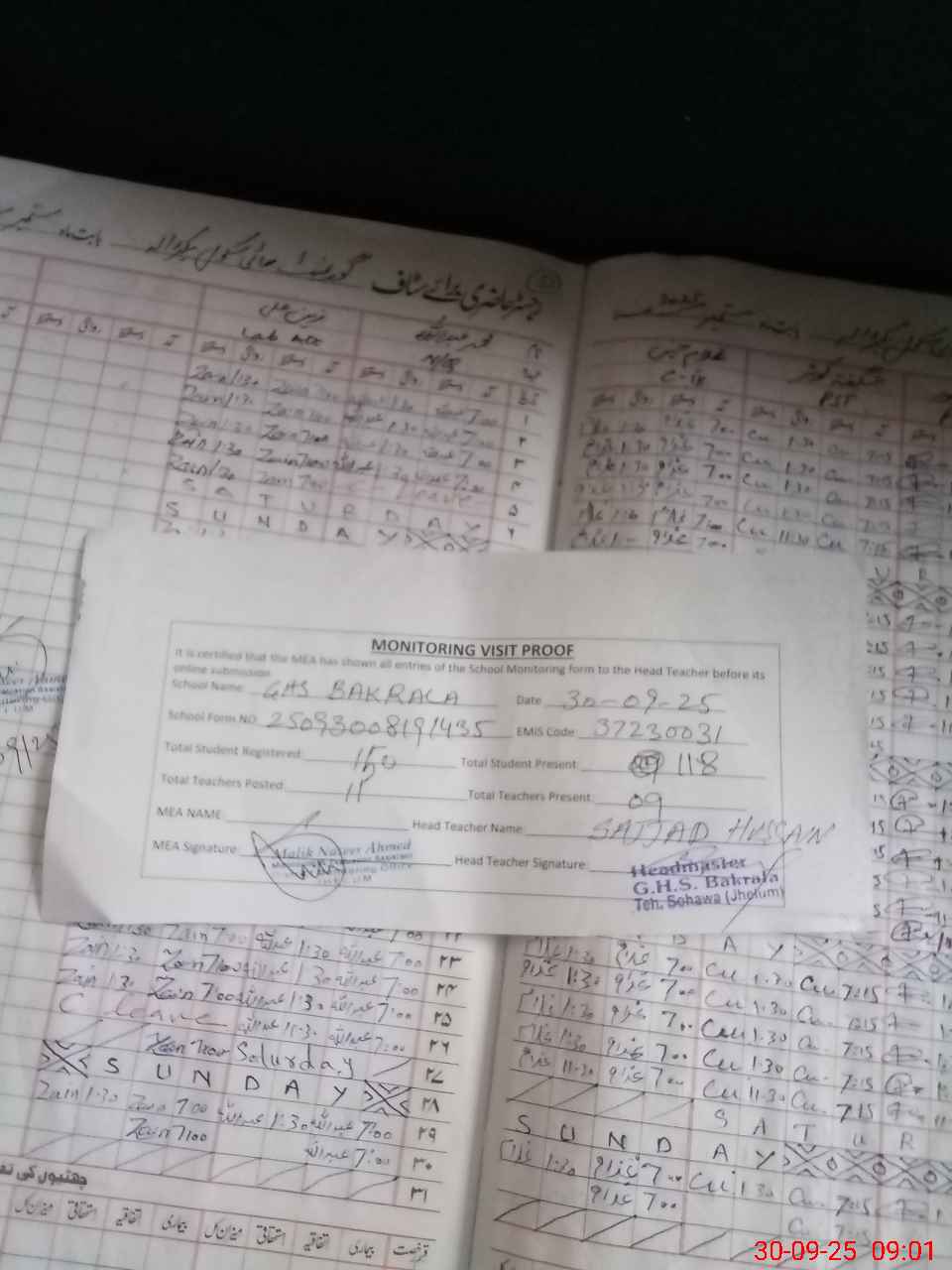 | Attendance Register | Head Teacher | MEA with School | Visit Proof |