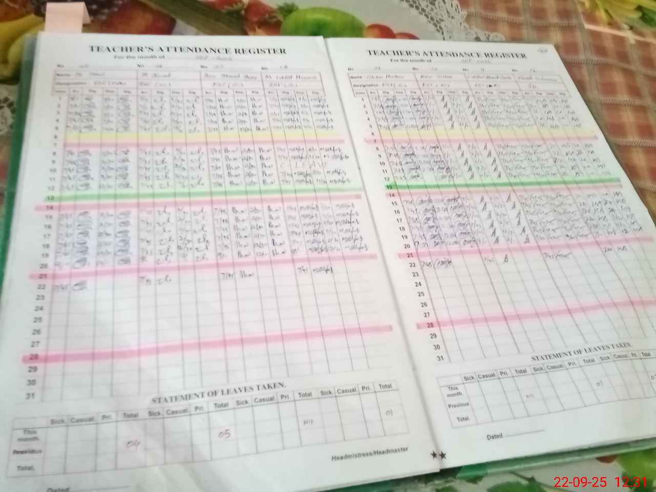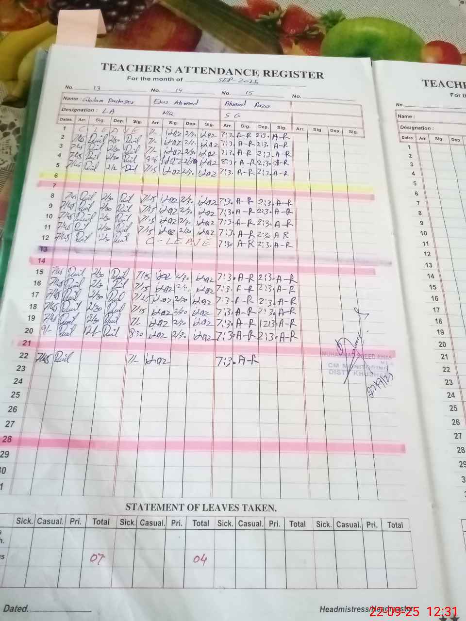 | CNIC | Full Name | Designation | R/C | Absence During Last Calender Month |