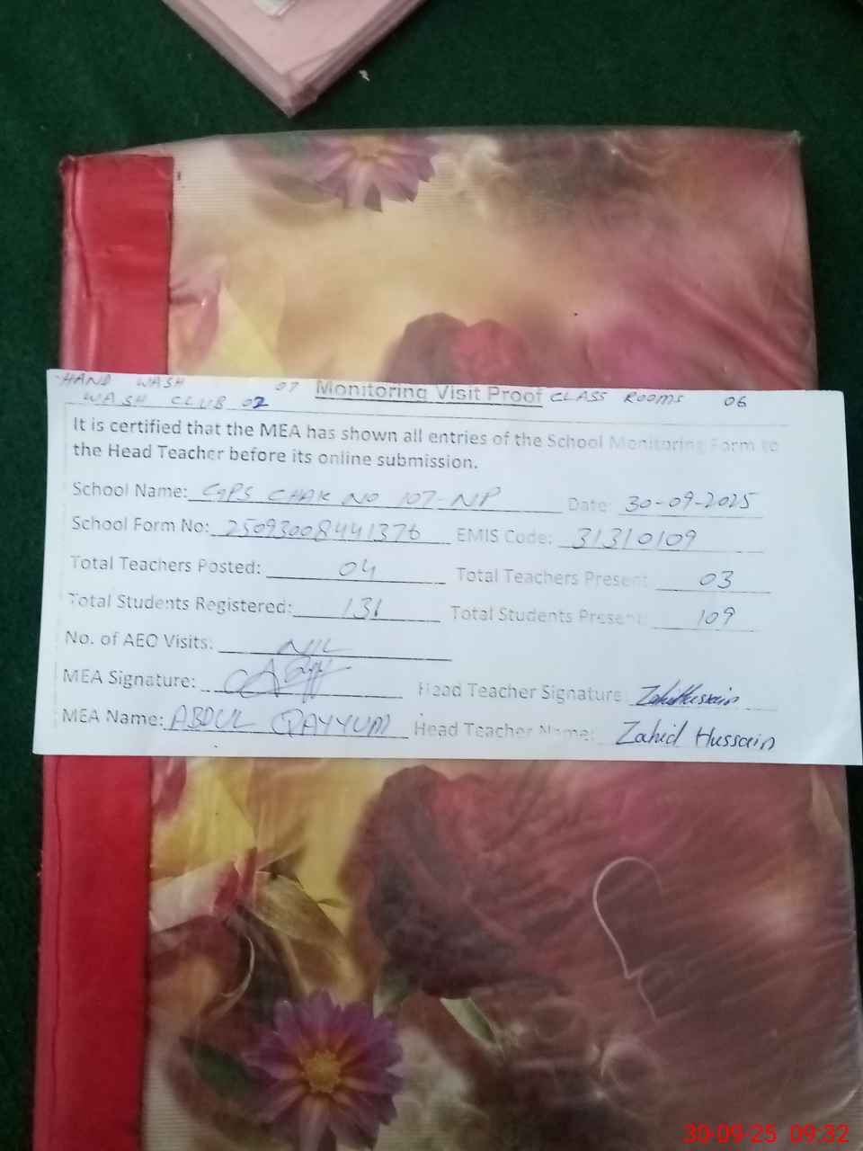 | EMIS Code: 31310109 | Name of School: GPS CHAK NO 107 NP (After Noon) | |||