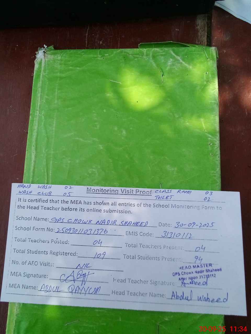 | Attendance Register | Head Teacher | MEA with School | Visit Proof |