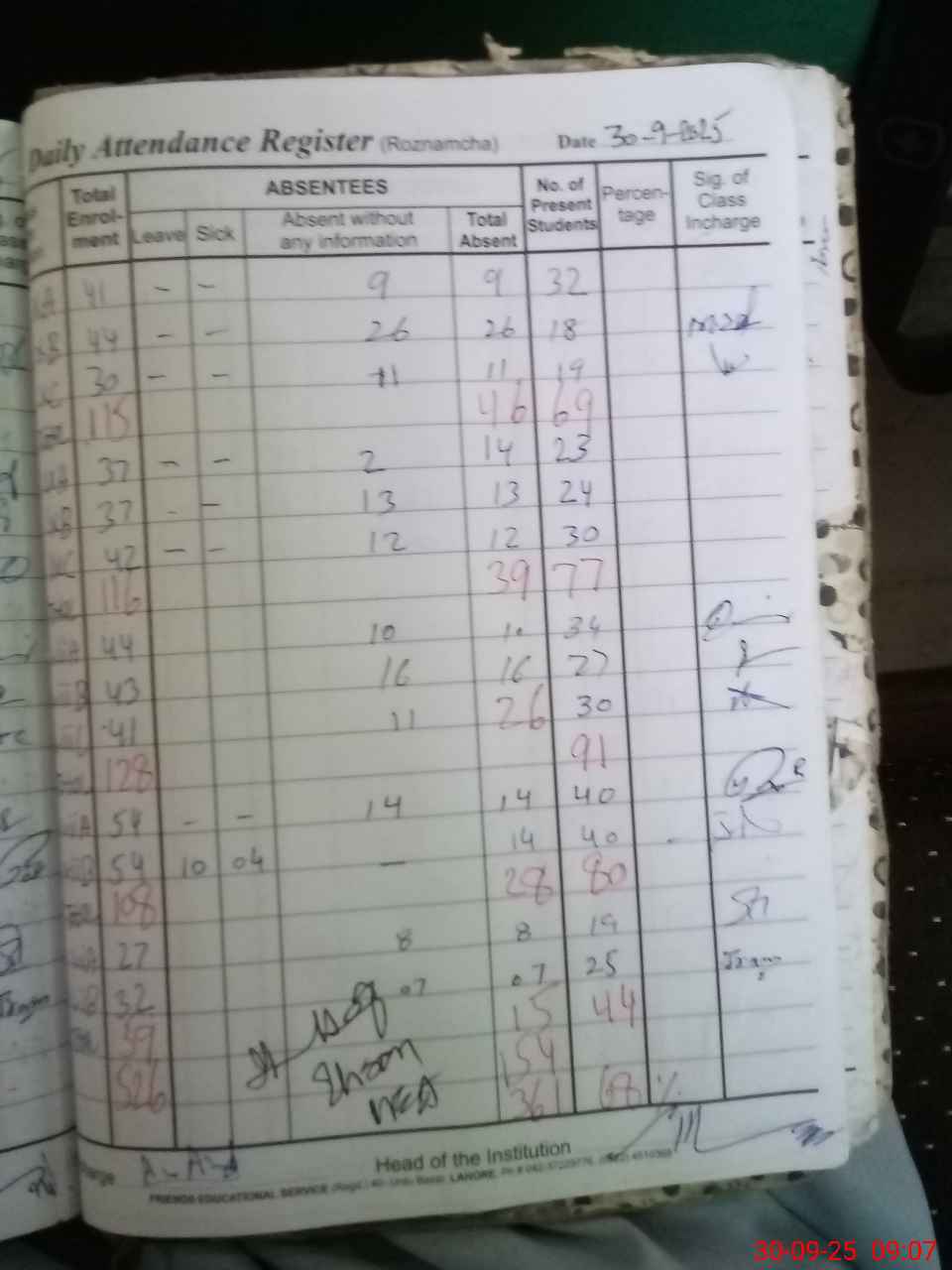 | Total Students Present | 0 | 0 | 0 | 0 | 0 | 0 | 0 | 0 | 44 | 80 | 91 | 77 | 69 | 361 | ||
