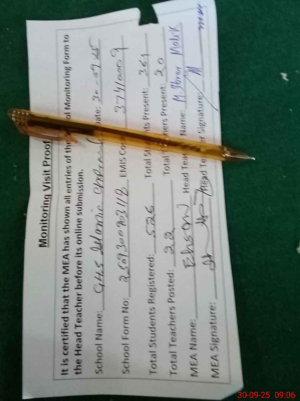 | Attendance Register | Head Teacher | MEA with School | Visit Proof |