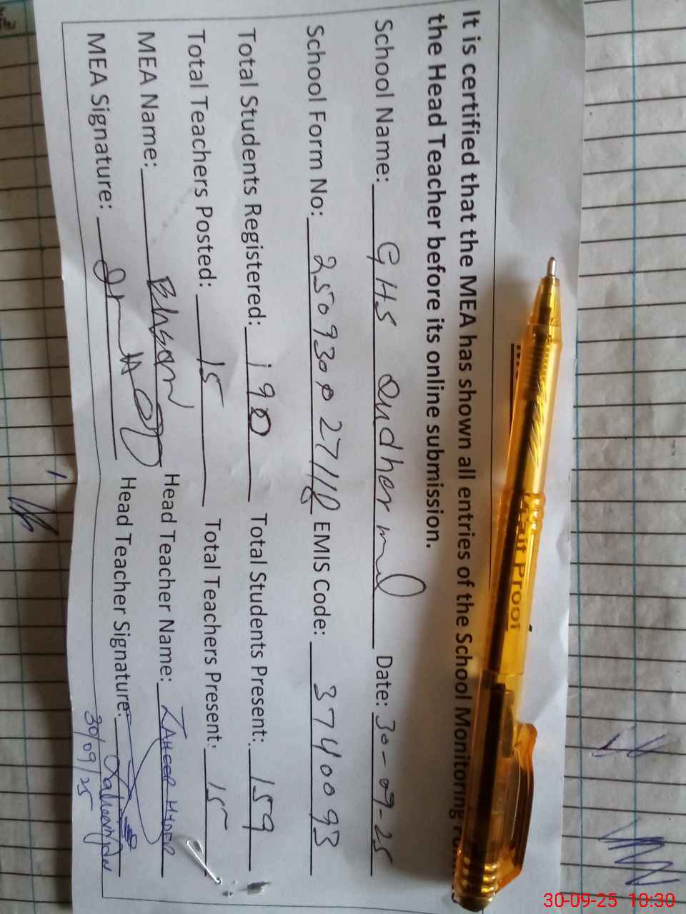 | Certified that this School was Inspected by the Undersigned MEA/DMO Today and the Information Stated Above is as Per Record. | |||||