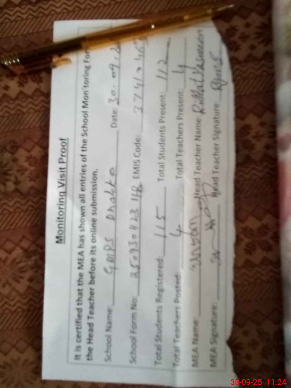 | Attendance Register | Head Teacher | MEA with School | Visit Proof |