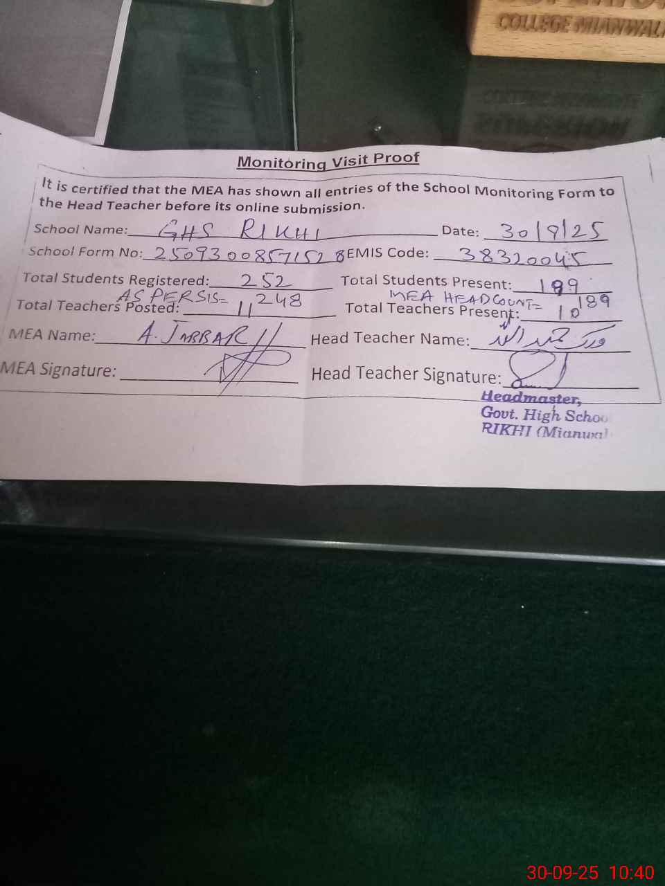 | Certified that this School was Inspected by the Undersigned MEA/DMO Today and the Information Stated Above is as Per Record. | |||||