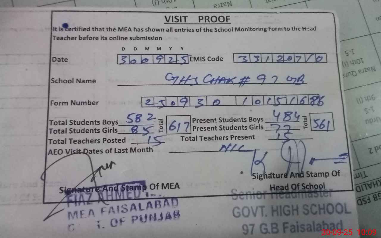 | EMIS Code: 33120710 | Name of School: GHS CHAK NO. 97 GB FSD | |||