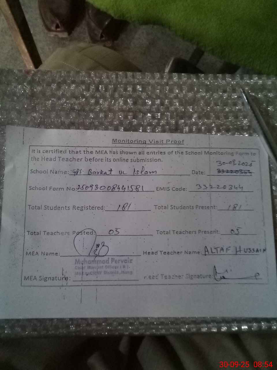 | Attendance Register | Head Teacher | MEA with School | Visit Proof |
