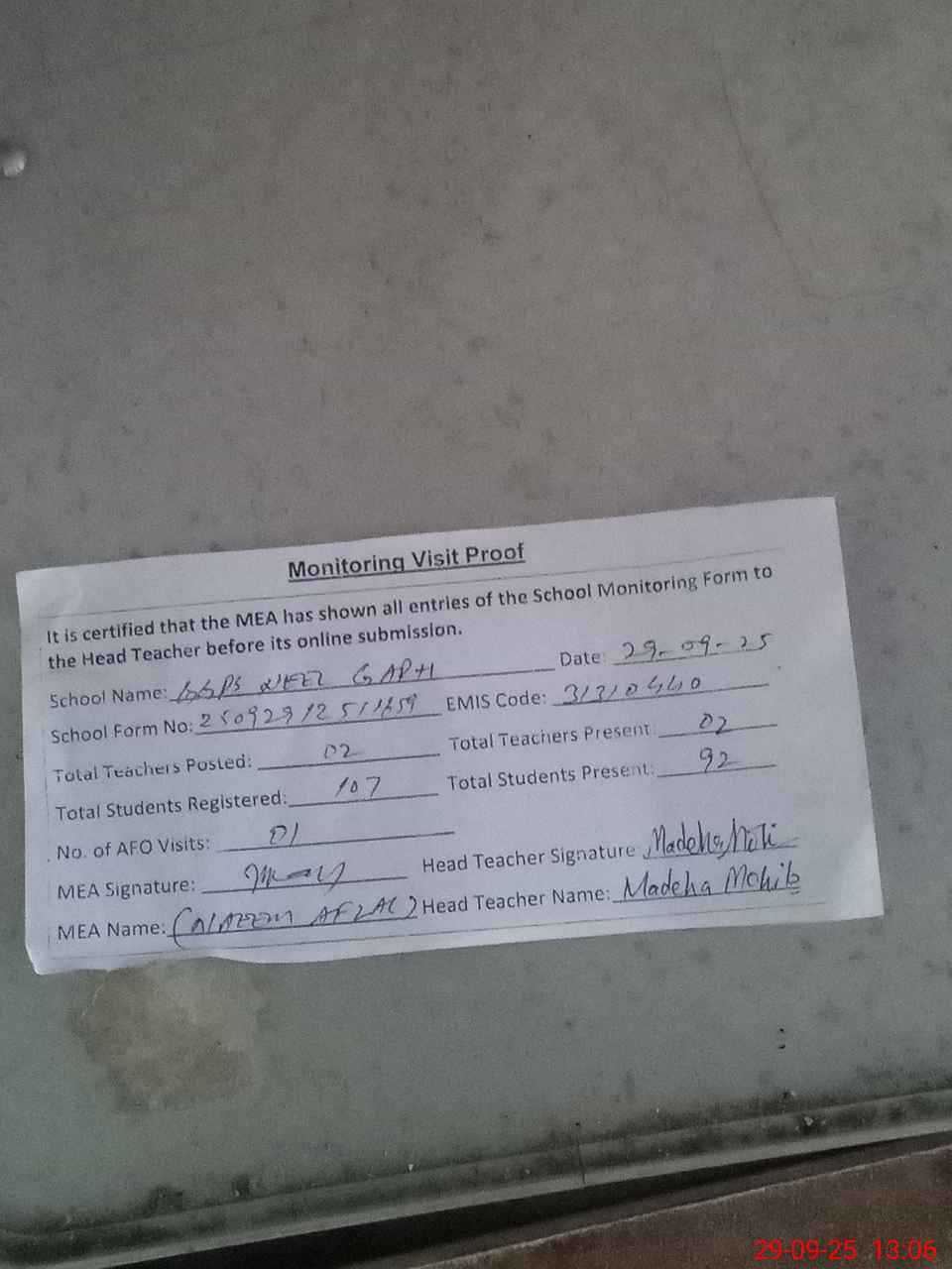 | Attendance Register | Head Teacher | MEA with School | Visit Proof |