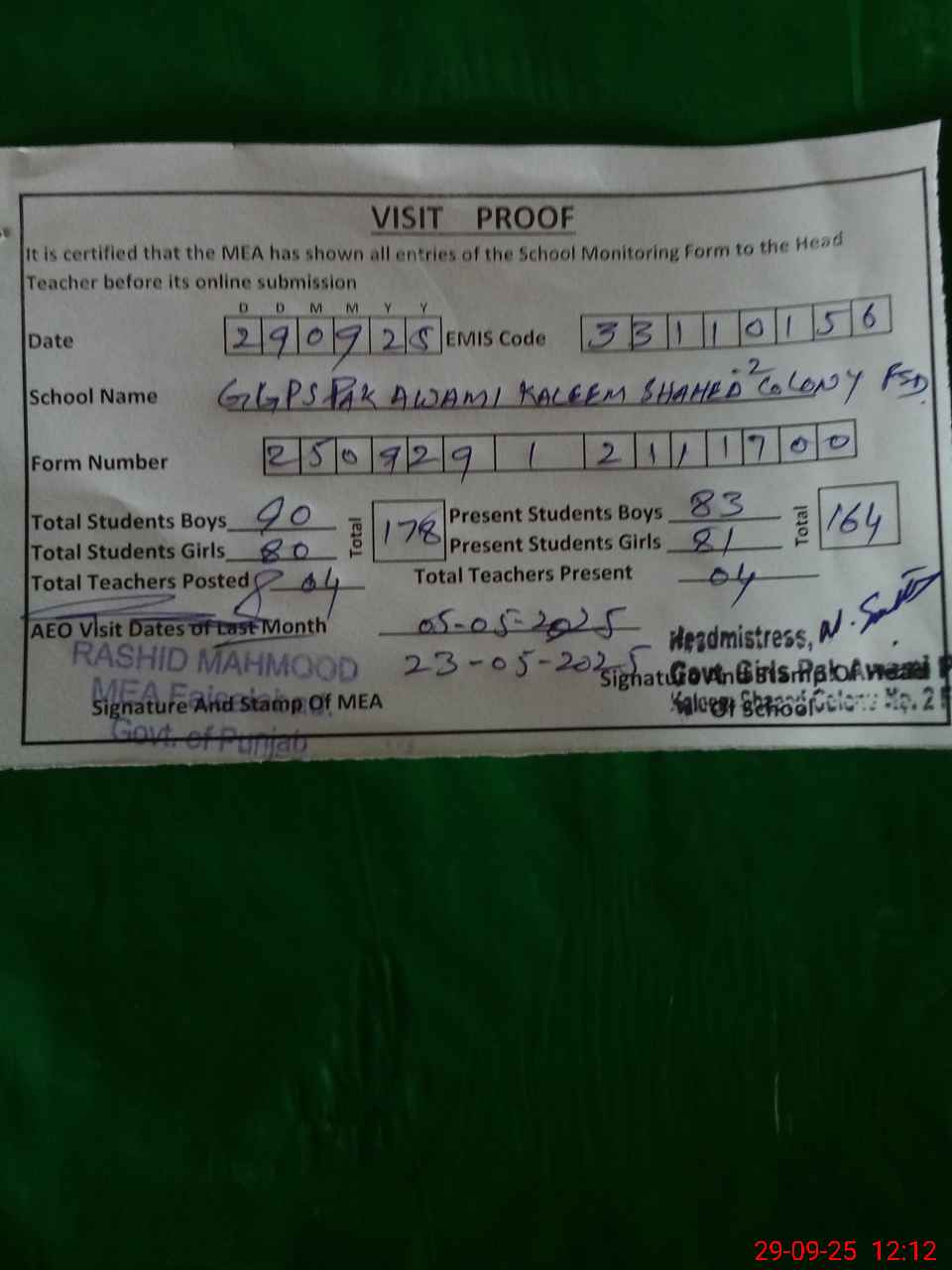 | EMIS Code: 33110156 | Name of School: GGPS PAK AWAMI KALIM SHAHEED COLONY- 2 | |||