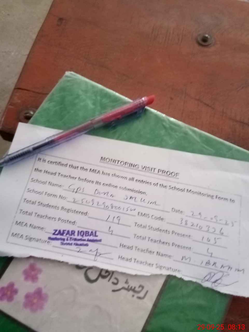 | Attendance Register | Head Teacher | MEA with School | Visit Proof |
