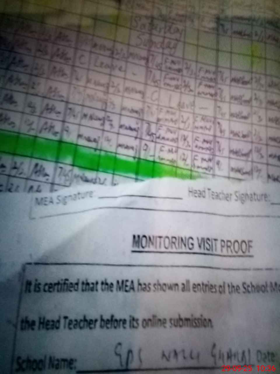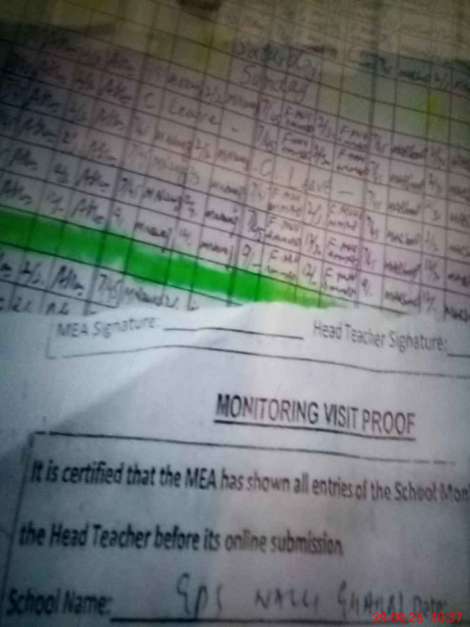 | Attendance Register | Head Teacher | MEA with School | Visit Proof |