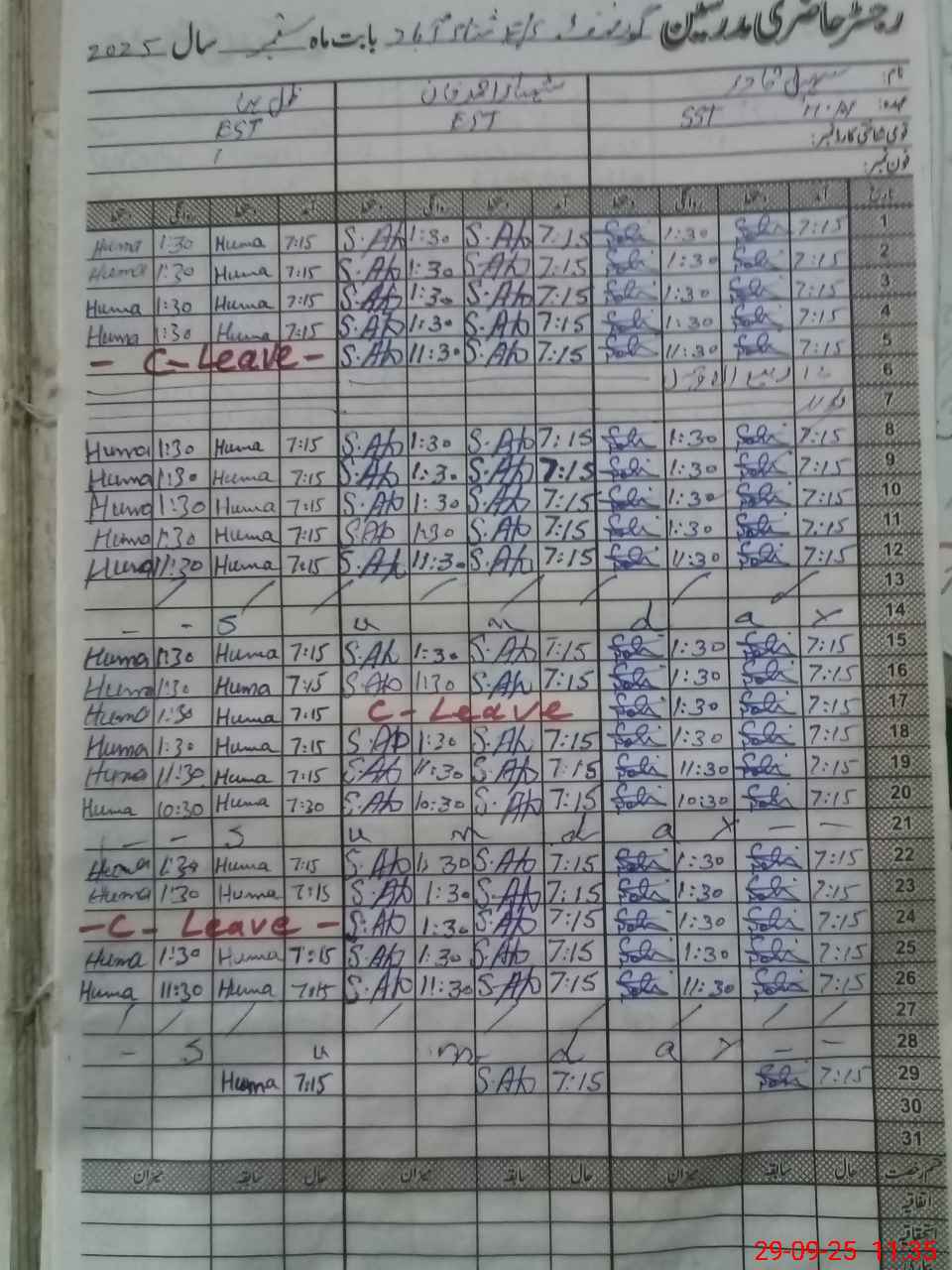 | Leave | Duty | Absent | Maternity | Medical | Ex- Pak |
