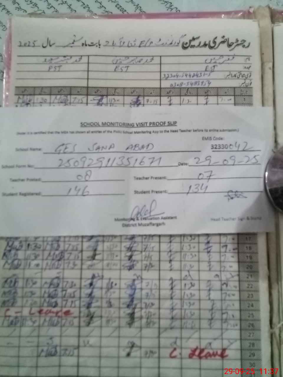 | Attendance Register | Head Teacher | MEA with School | Visit Proof |