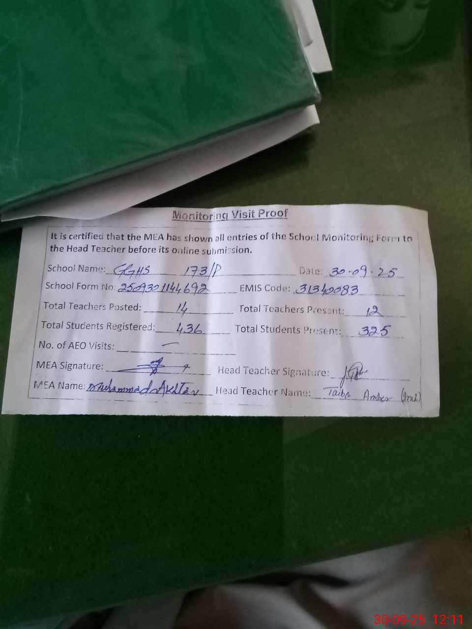 | Attendance Register | Head Teacher | MEA with School | Visit Proof |
