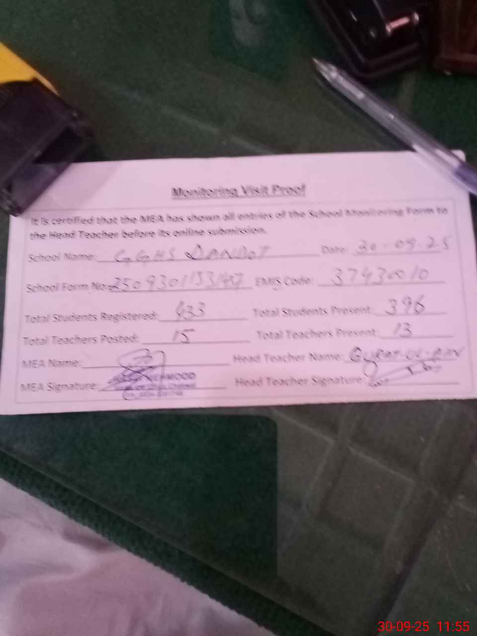| Attendance Register | Head Teacher | MEA with School | Visit Proof |