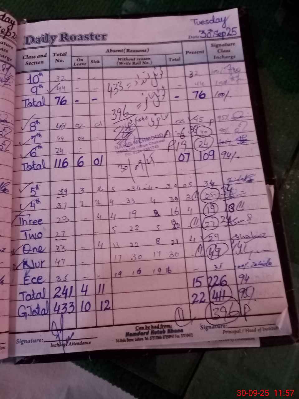 | Total Students Present | 35 | 0 | 44 | 29 | 24 | 18 | 34 | 34 | 19 | 38 | 45 | 44 | 32 | 396 | ||
