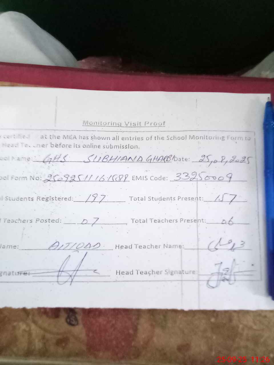 | Attendance Register | Head Teacher | MEA with School | Visit Proof |