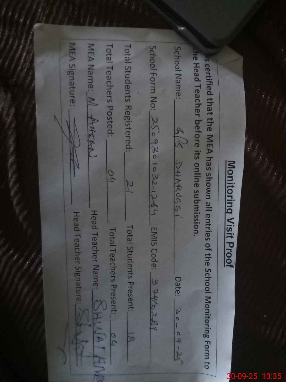 | Attendance Register | Head Teacher | MEA with School | Visit Proof |