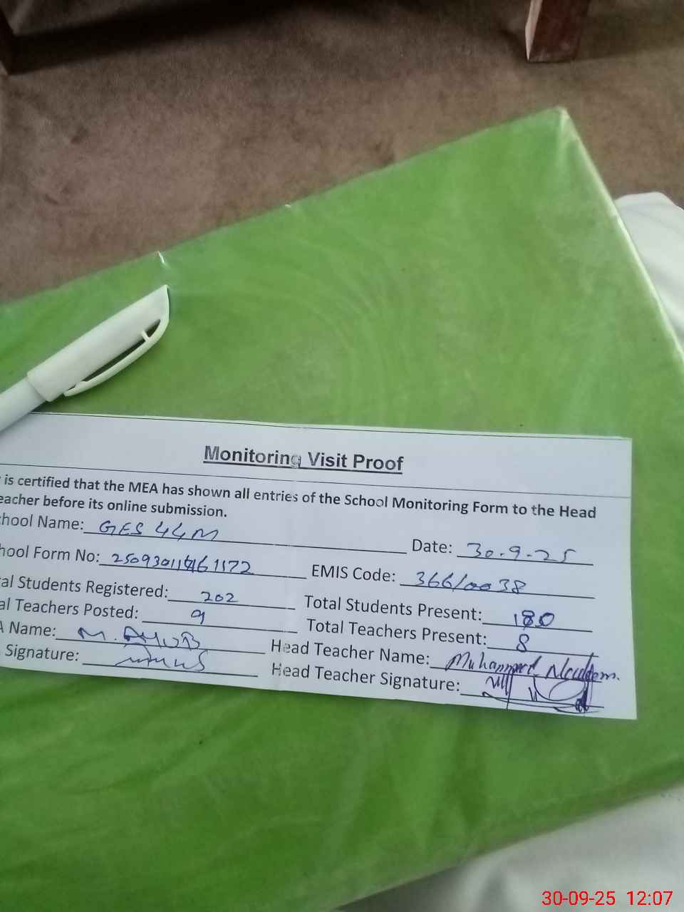 | Attendance Register | Head Teacher | MEA with School | Visit Proof |