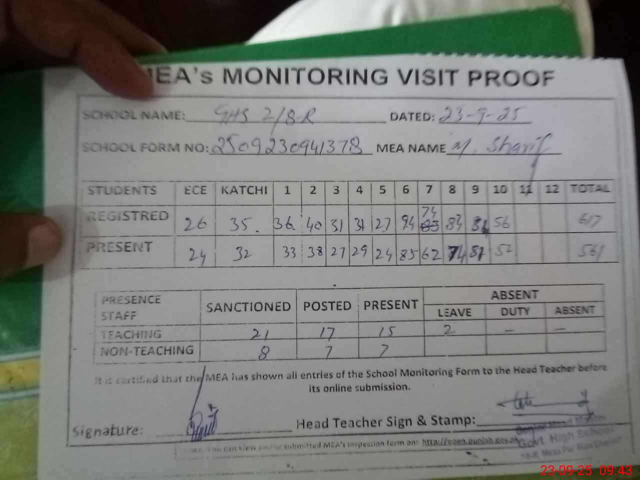 | Attendance Register | Head Teacher | MEA with School | Visit Proof |
