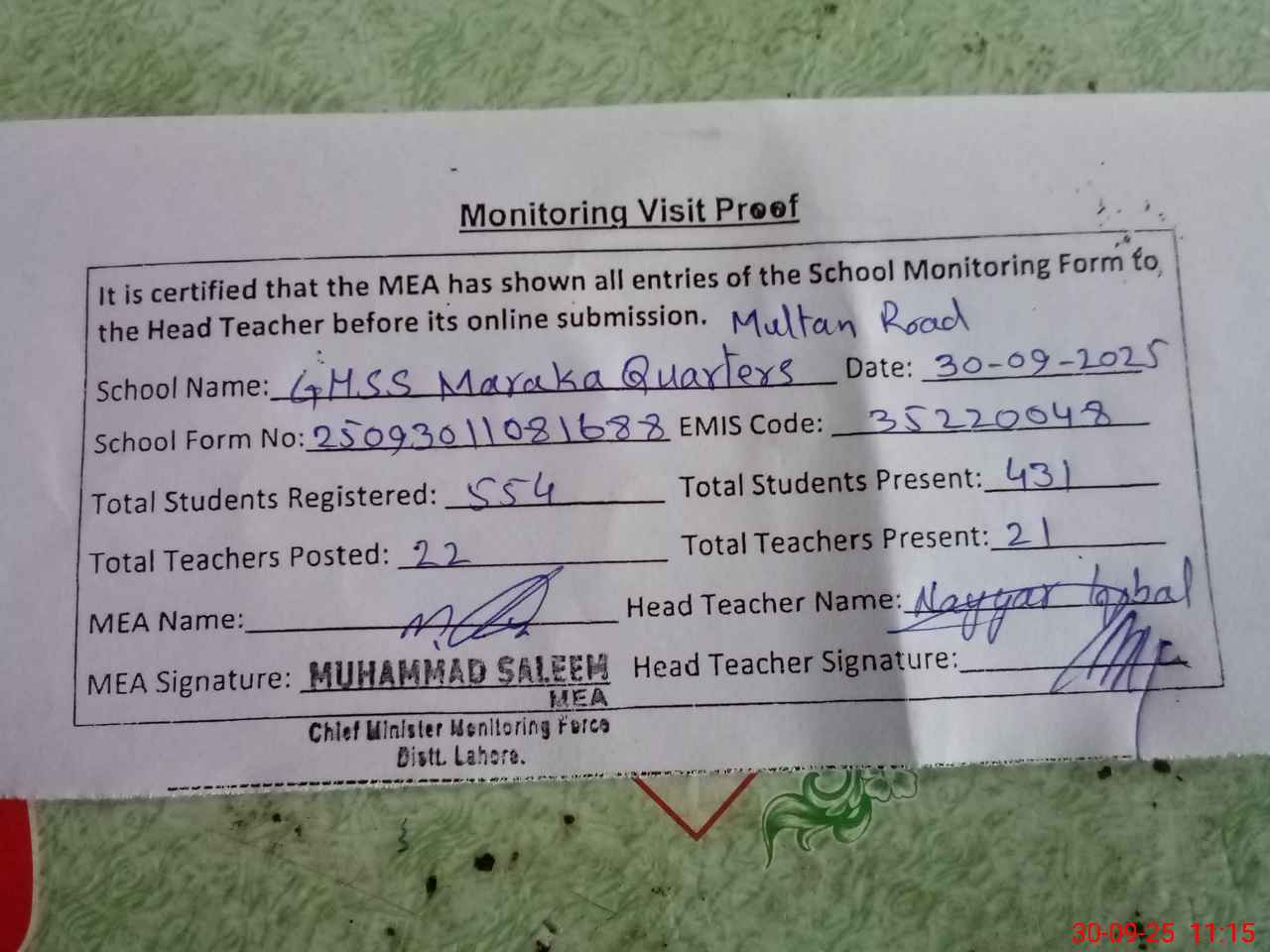 | EMIS Code: 35220048 | Name of School: GHSS MARAKA QUARTERS MULTAN ROAD | |||