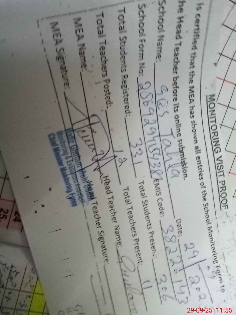 | Certified that this School was Inspected by the Undersigned MEA/DMO Today and the Information Stated Above is as Per Record. | |||||