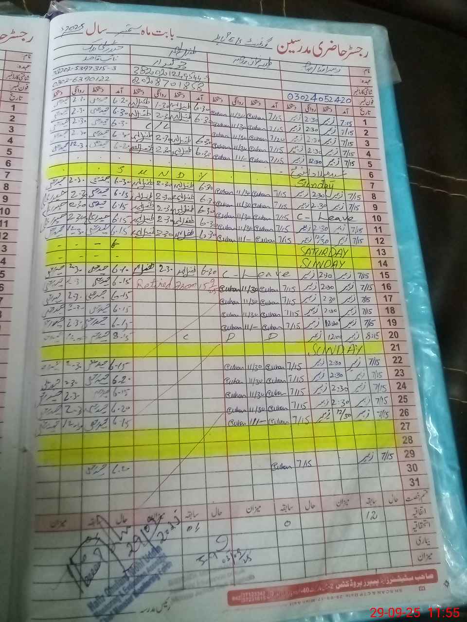 | CNIC | Full Name | Designation | R/C | Absence During Last Calender Month |