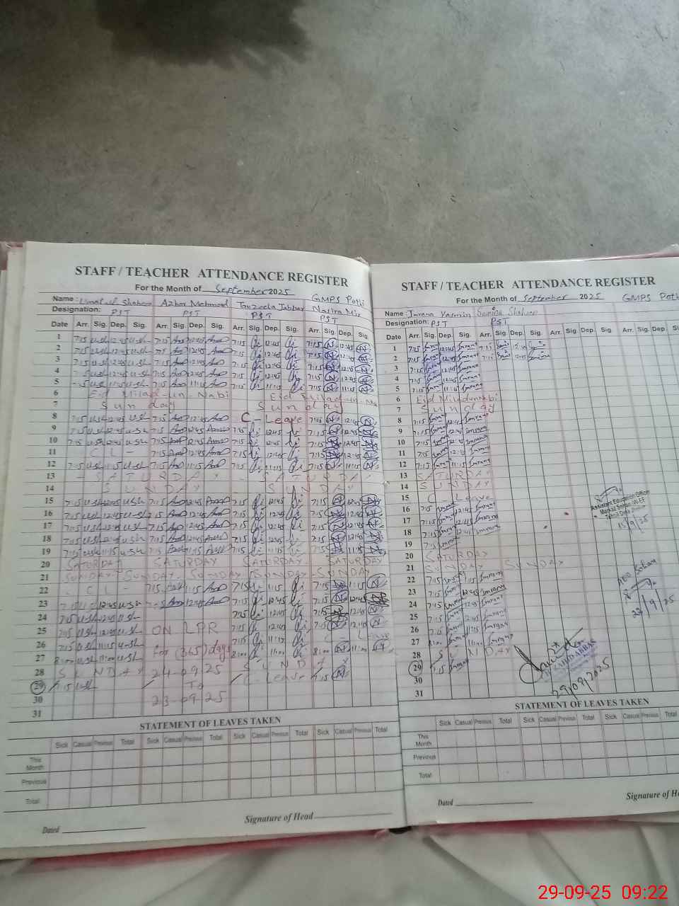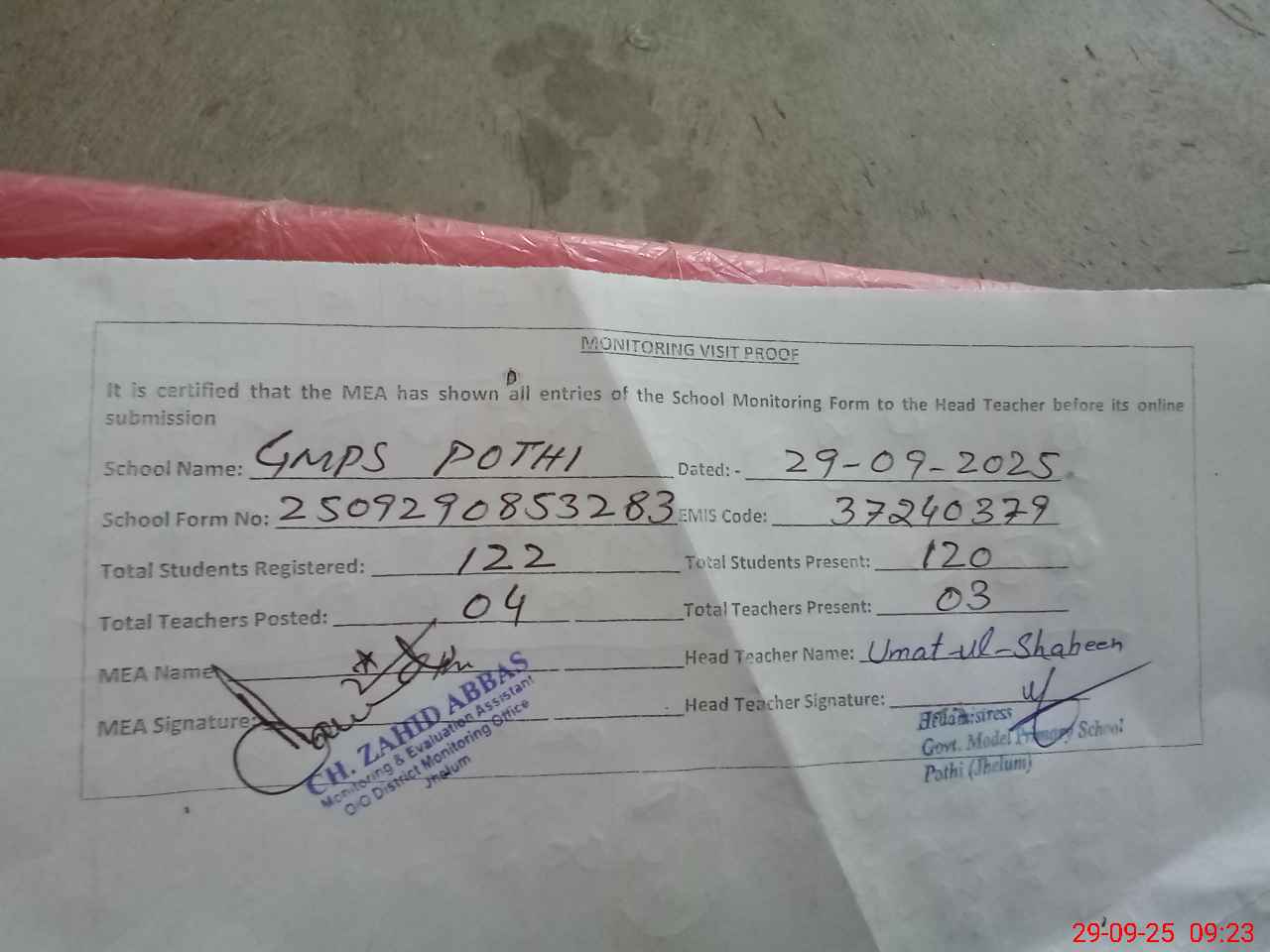 | Monitoring Date: 29-09-2025 | Start Time: 29-09-2025 08:53 AM | End Time: 29-09-2025 09:32 AM | Name of MEA: Za**** Ab**** | |