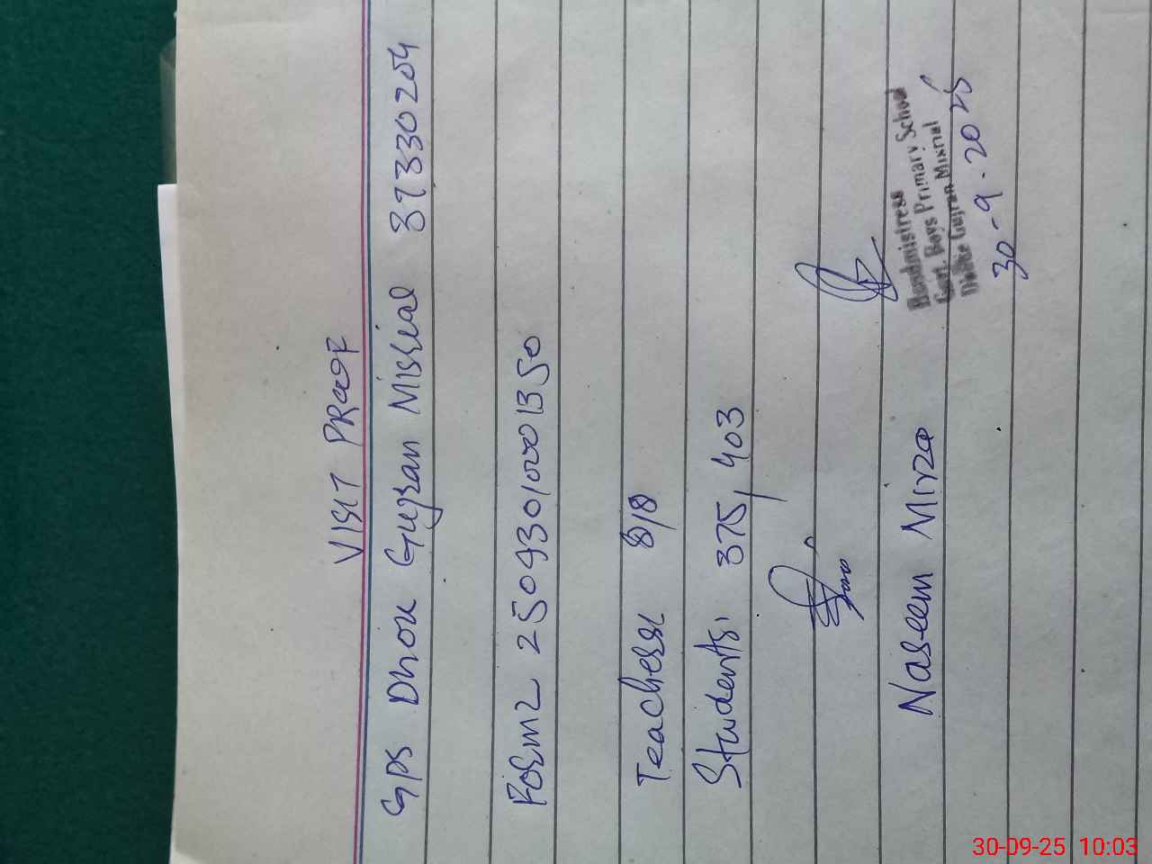 | Attendance Register | Head Teacher | MEA with School | Visit Proof |