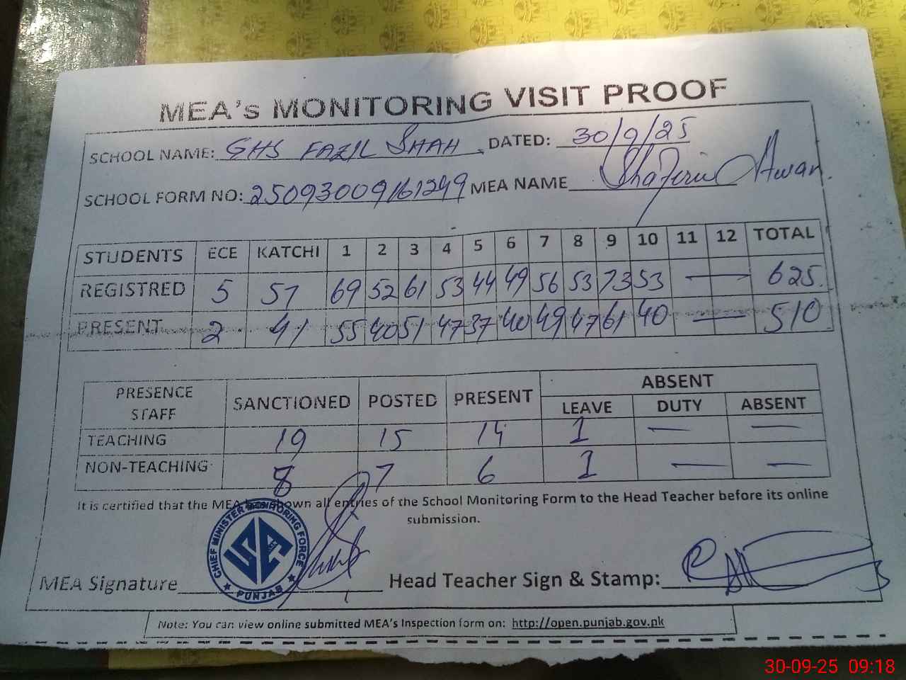 | EMIS Code: 36410056 | Name of School: GHS FAZIL SHAH, P/O SARDAR PUR, SARAI SIDHU | |||