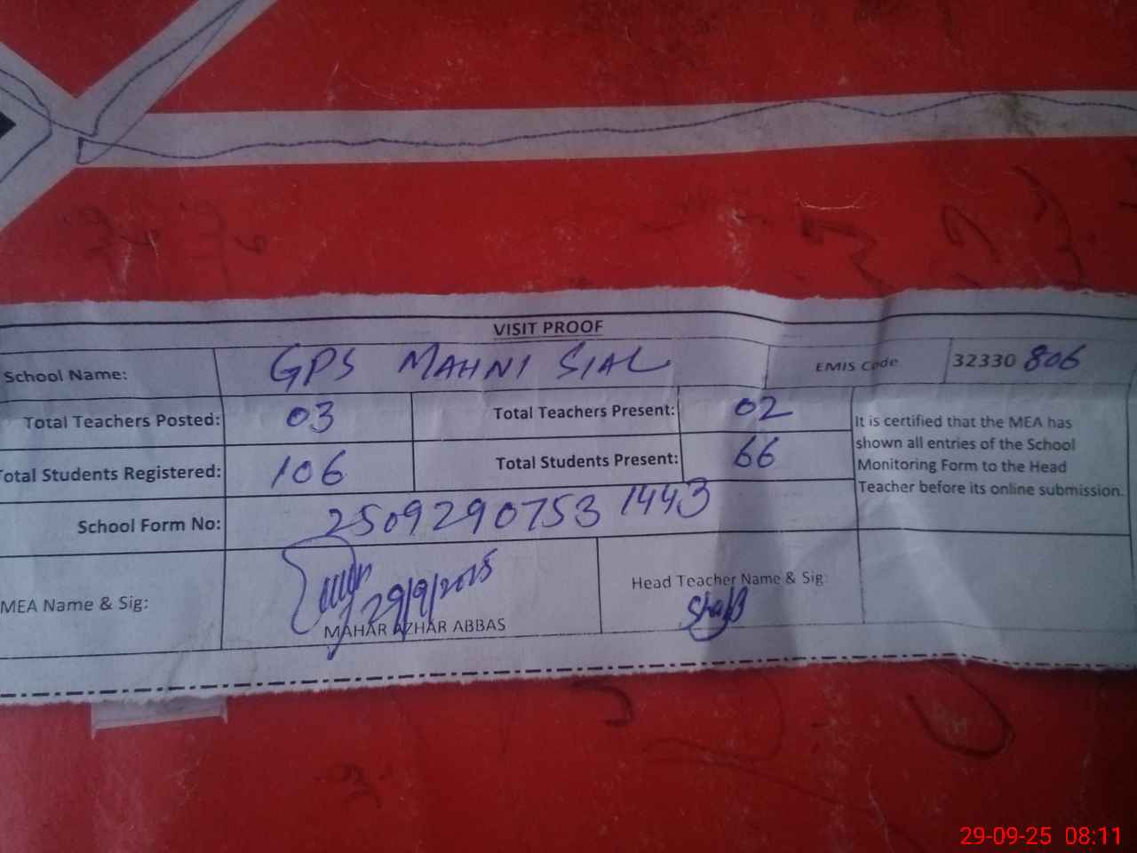 | Attendance Register | Head Teacher | MEA with School | Visit Proof |