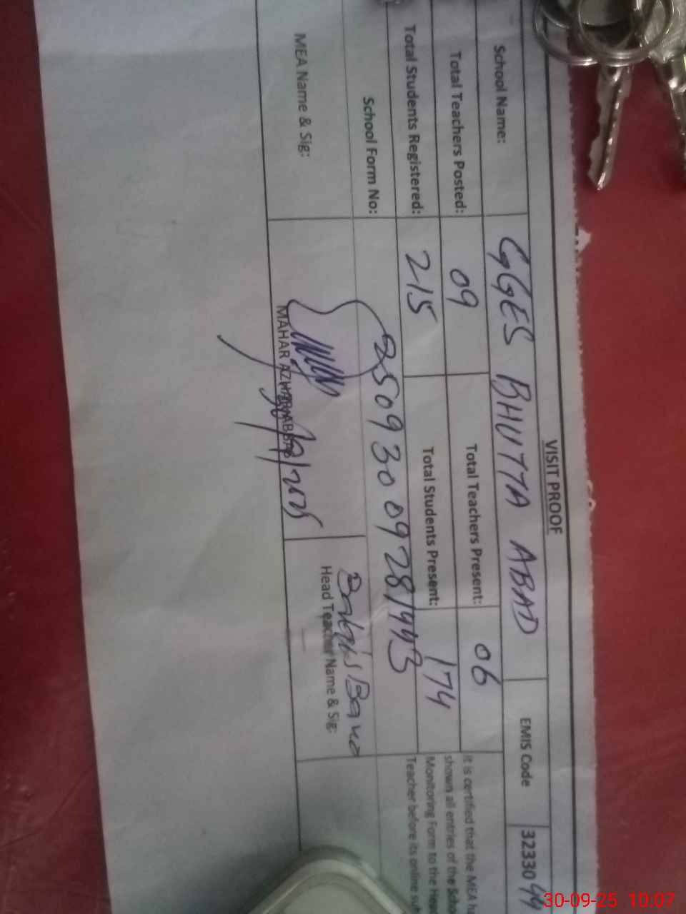 | Attendance Register | Head Teacher | MEA with School | Visit Proof |