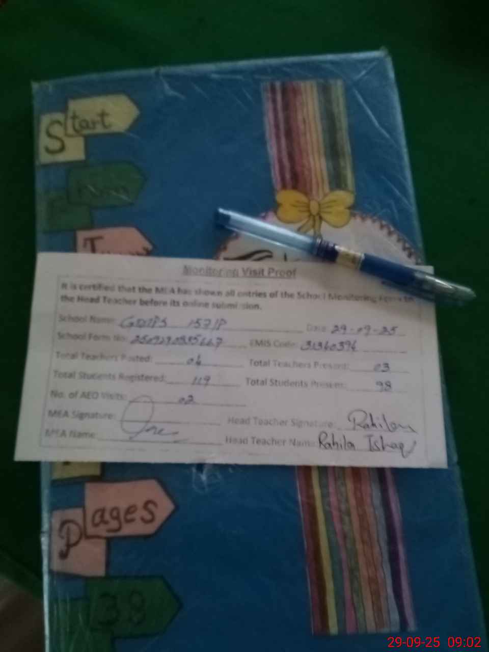 | Attendance Register | Head Teacher | MEA with School | Visit Proof |