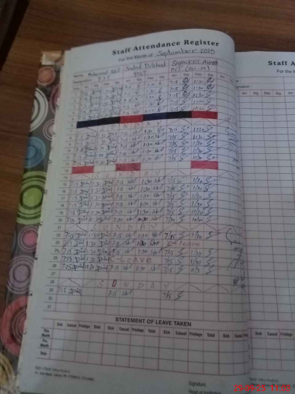 | CNIC | Full Name | Designation | R/C | Absence During Last Calender Month |