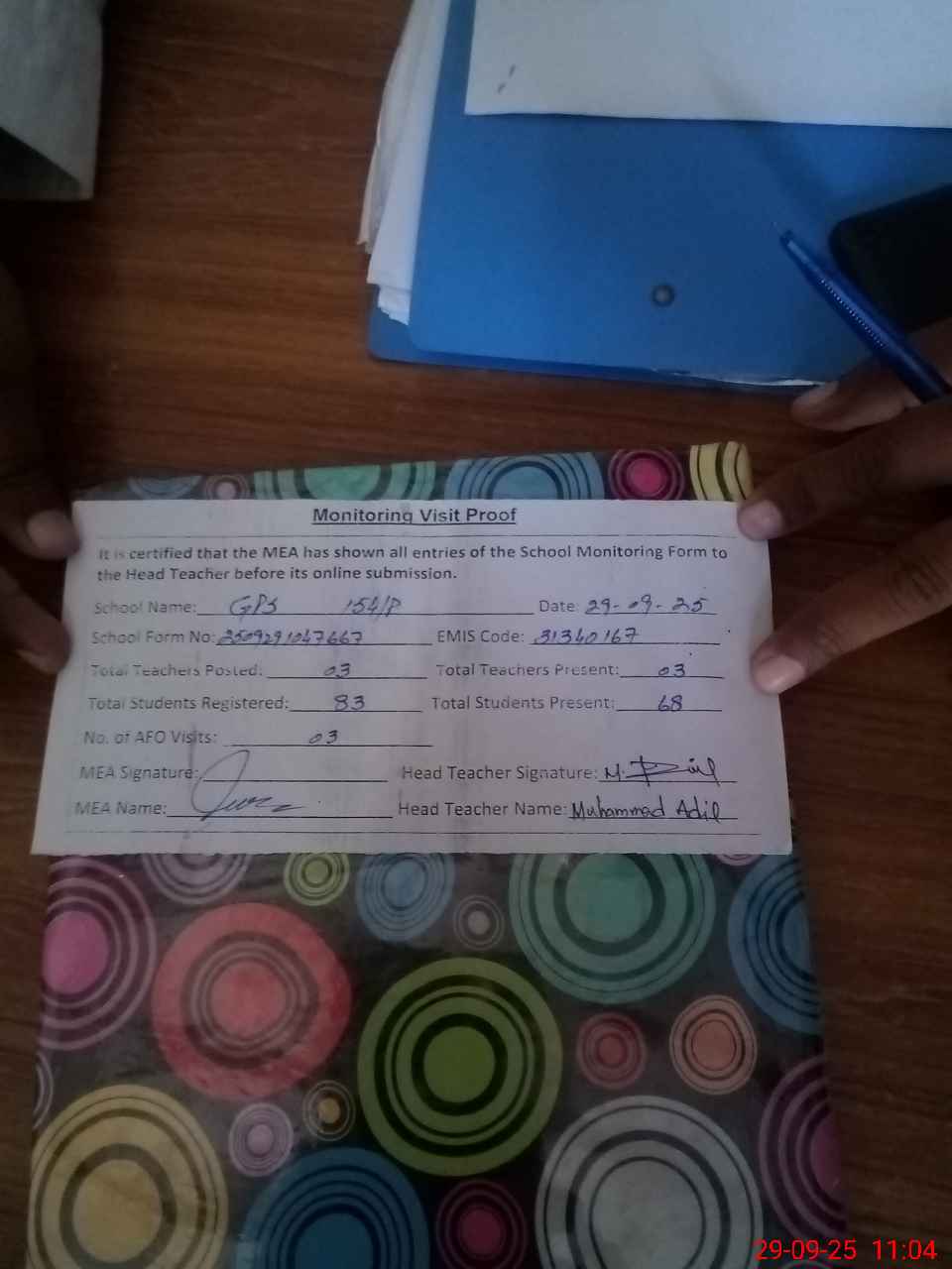 | Attendance Register | Head Teacher | MEA with School | Visit Proof |