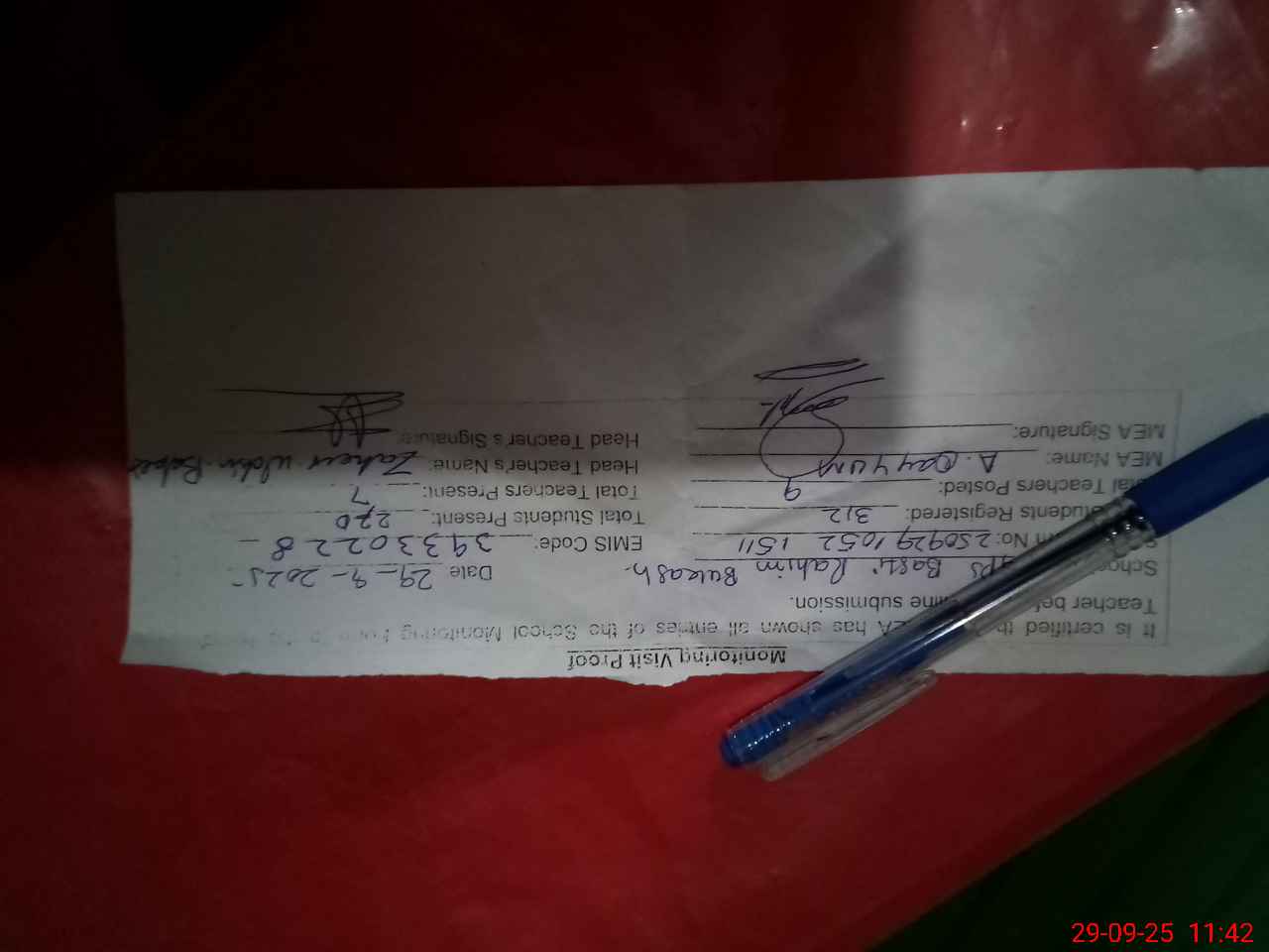 | Attendance Register | Head Teacher | MEA with School | Visit Proof |