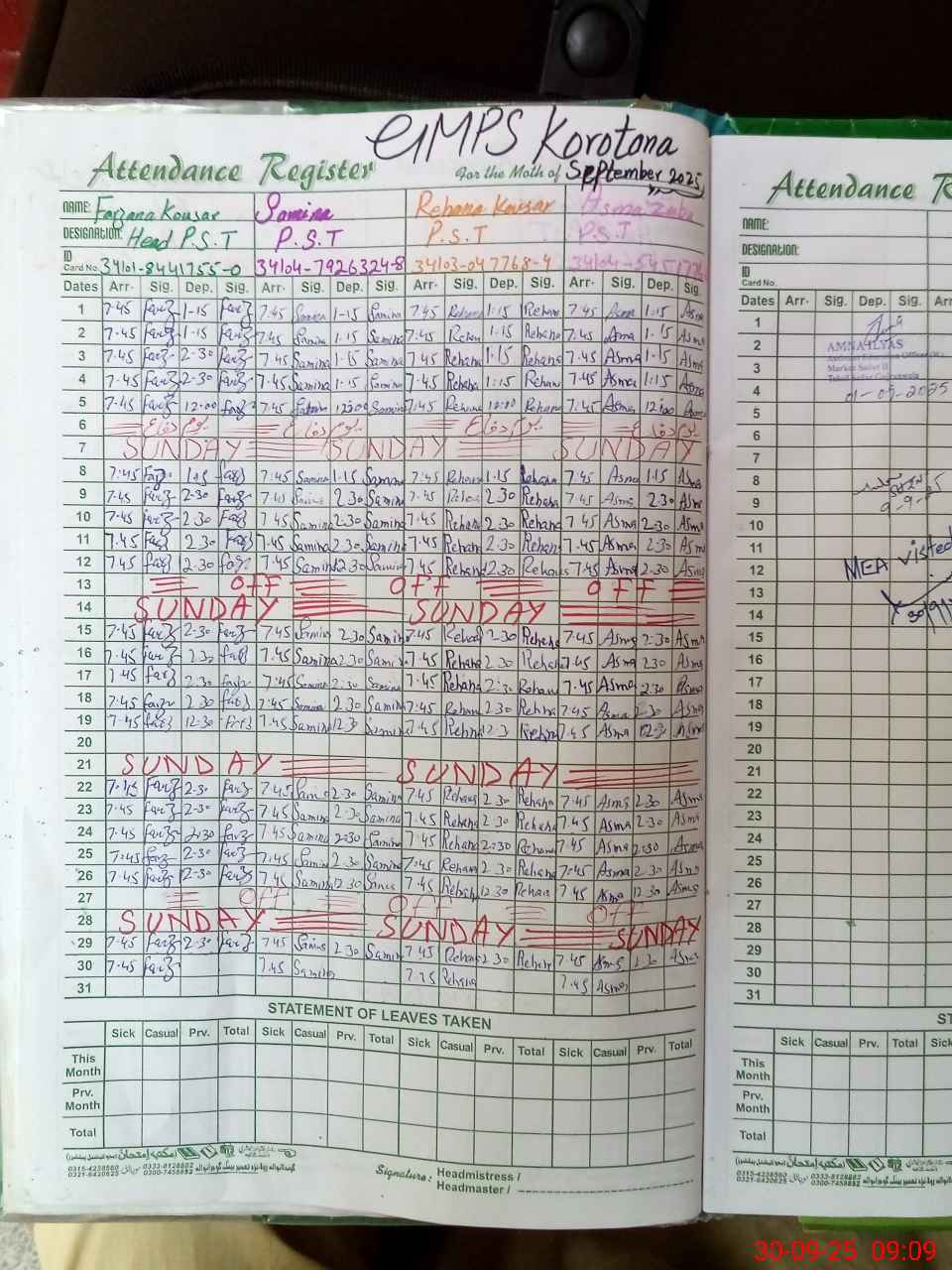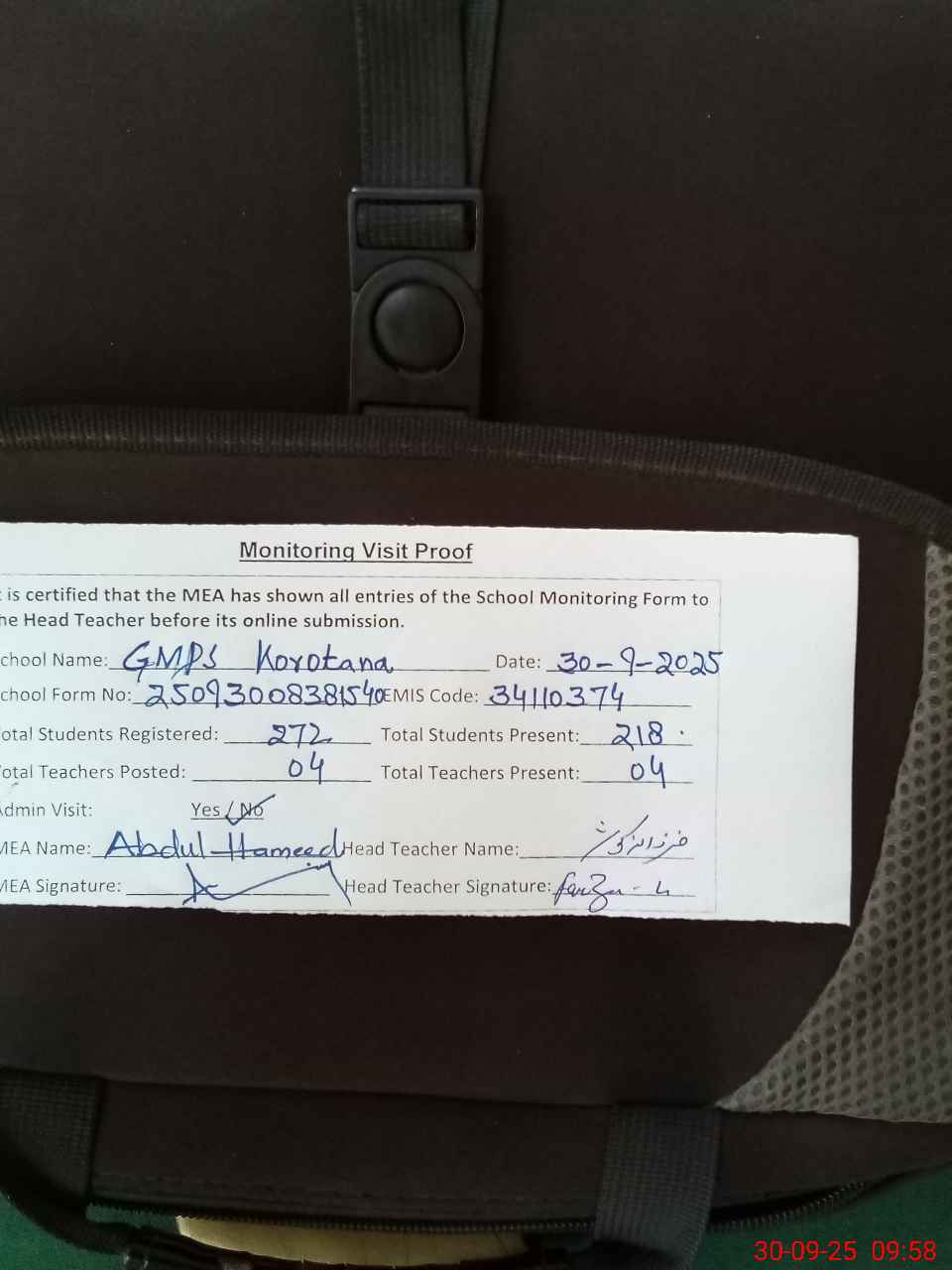 | Attendance Register | Head Teacher | MEA with School | Visit Proof |