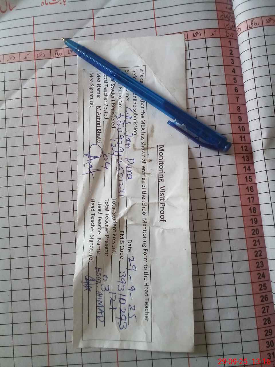 | Attendance Register | Head Teacher | MEA with School | Visit Proof |