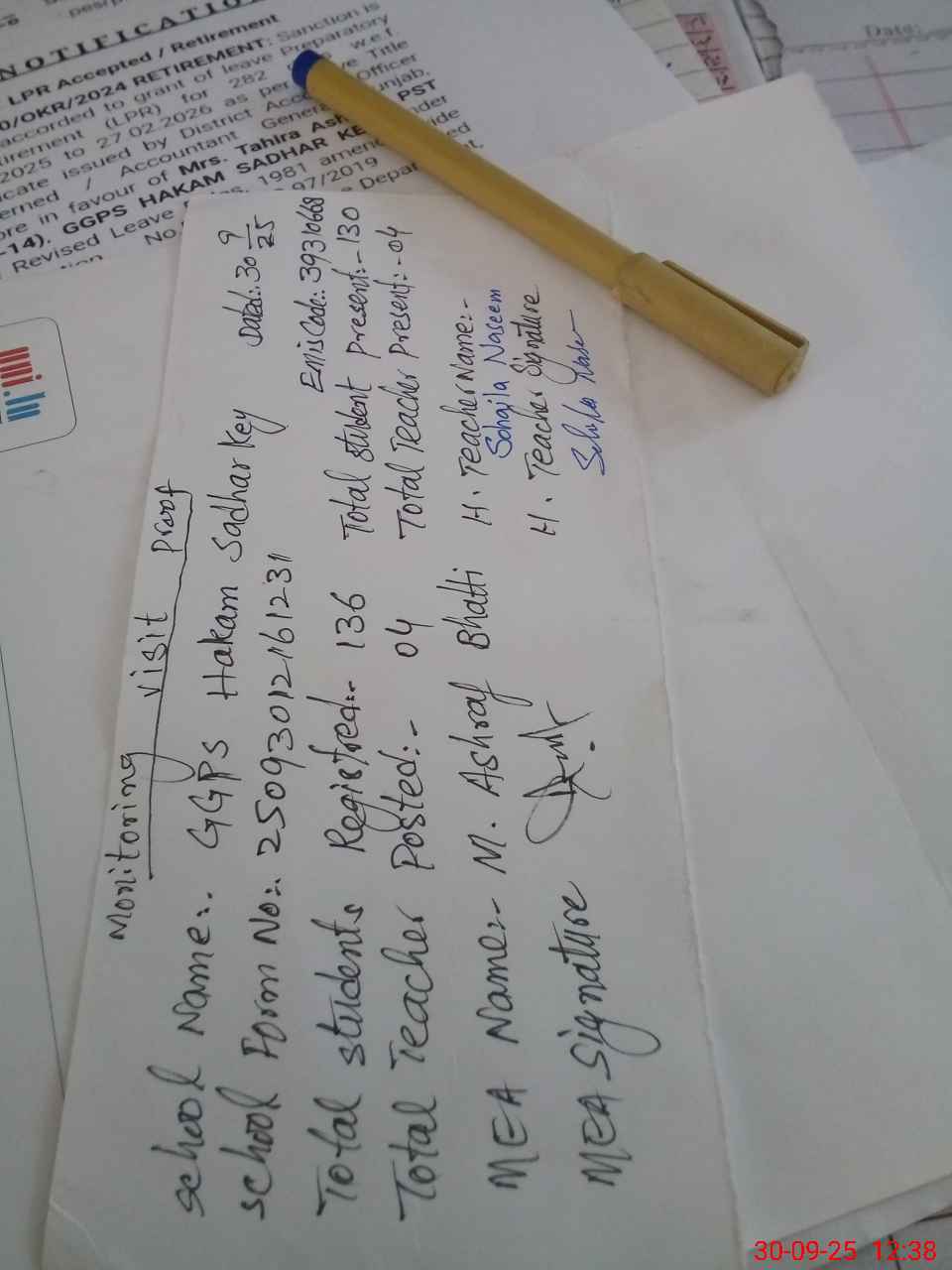 | Attendance Register | Head Teacher | MEA with School | Visit Proof |