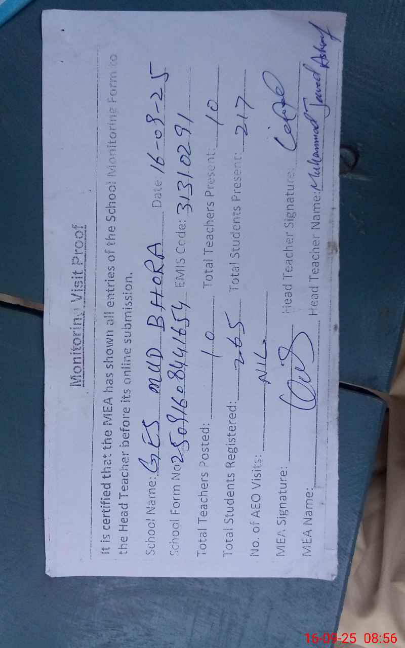 | Attendance Register | Head Teacher | MEA with School | Visit Proof |