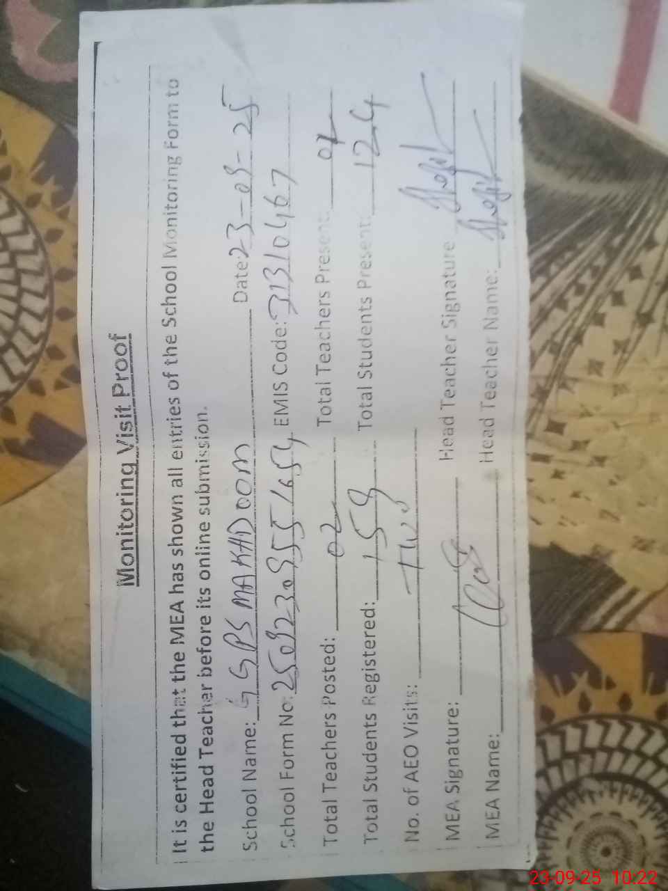 | Attendance Register | Head Teacher | MEA with School | Visit Proof |