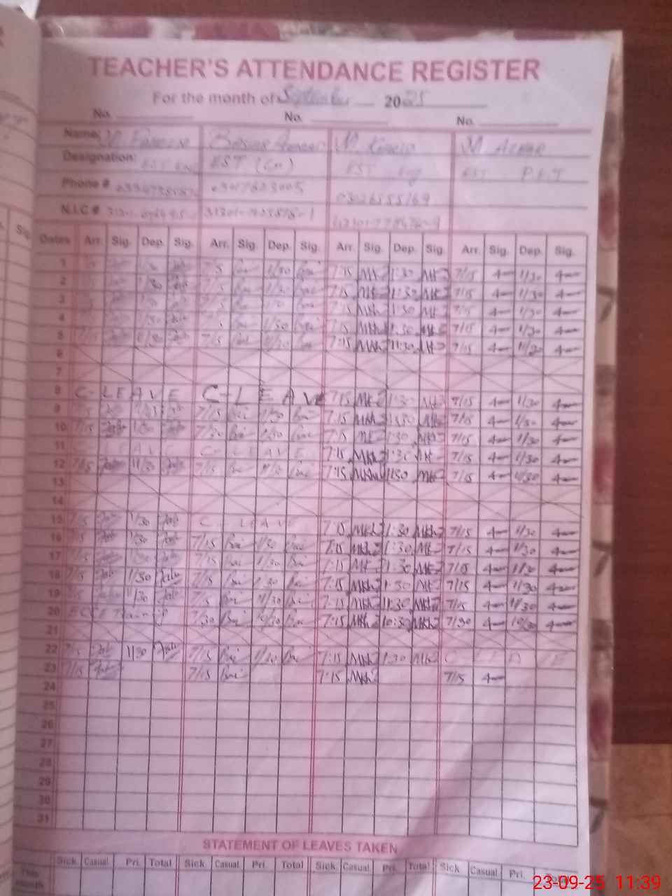 | CNIC | Full Name | Designation | R/C | Absence during last cal. month |