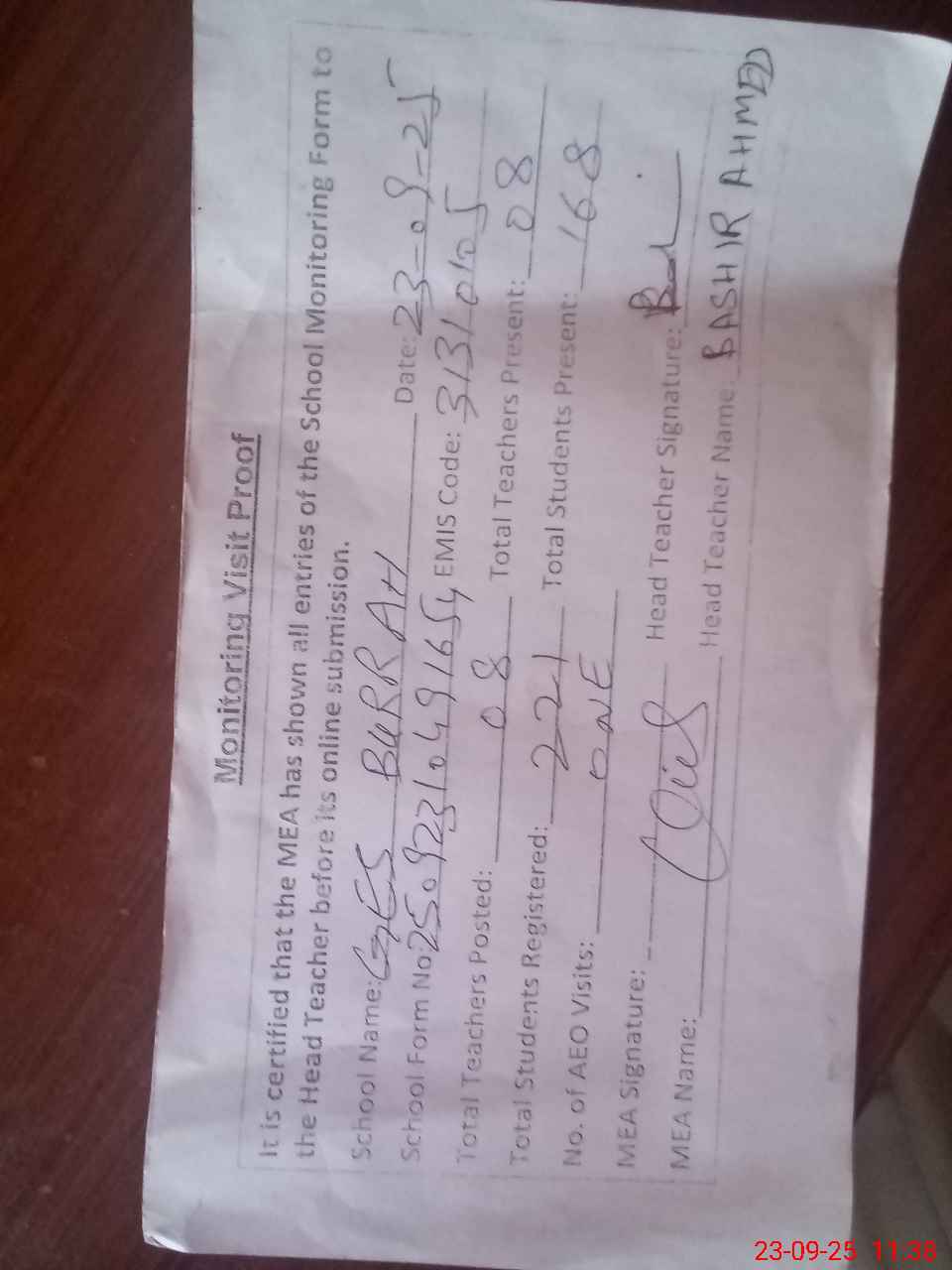 | Attendance Register | Head Teacher | MEA with School | Visit Proof |