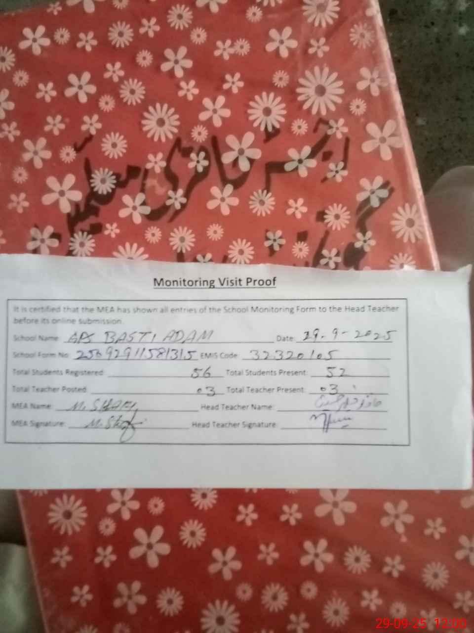 | Attendance Register | Head Teacher | MEA with School | Visit Proof |
