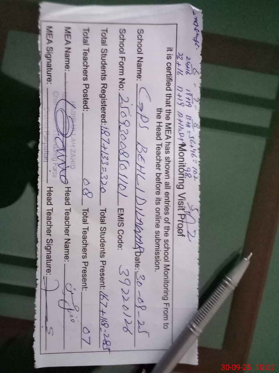 | Remarks (Use Separate Page if Required): Note Teacher MUHAMMAD ASLAM PST FOUND ABSENT WITH OUT ON LINE SANCTIONED CLEAVE DT 30 SEP 2025 | |||||