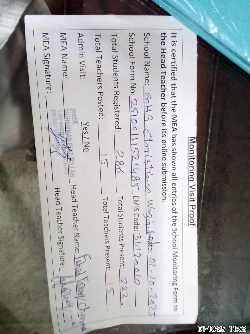 | Attendance Register | Head Teacher | MEA with School | Visit Proof |