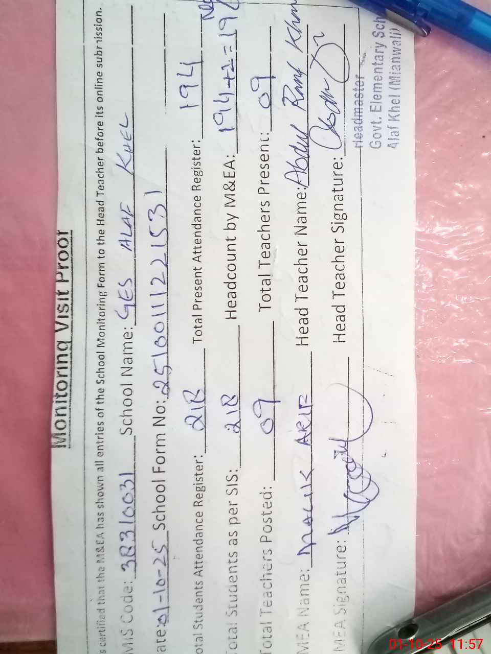| Attendance Register | Head Teacher | MEA with School | Visit Proof |