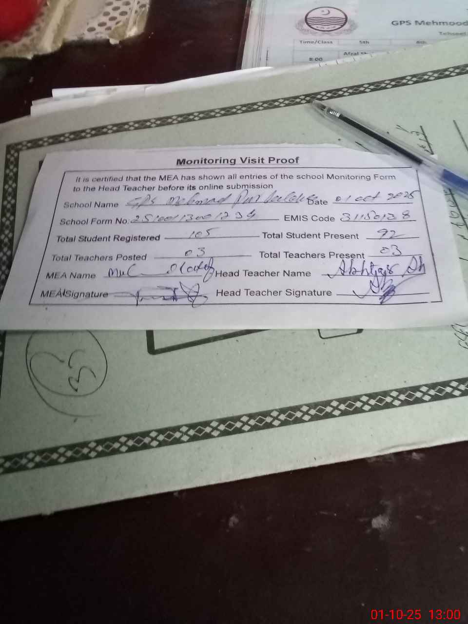 | Attendance Register | Head Teacher | MEA with School | Visit Proof |
